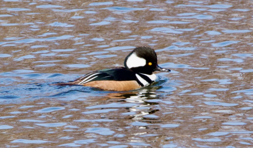 The beautiful Hooded Merganser is seen often in winter at the Helen Carlson Preserve, in the Connecticut River, or in Great Hill Pond. This one surfaced with a small fish in its mouth. They nest in tree cavities.