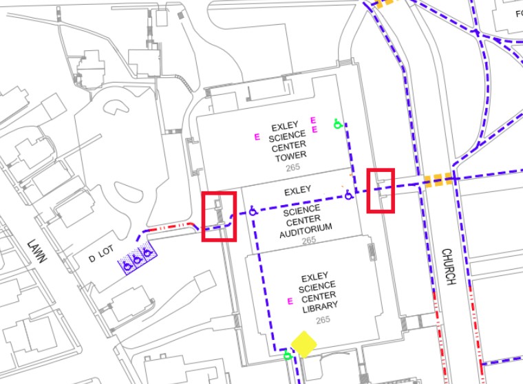 For those unfamiliar with Exley Science center and the Woodhead Lounge, see the image below. You can enter the building either from Church Street or Lawn Avenue. The Woodhead Lounge is shown by the yellow square.